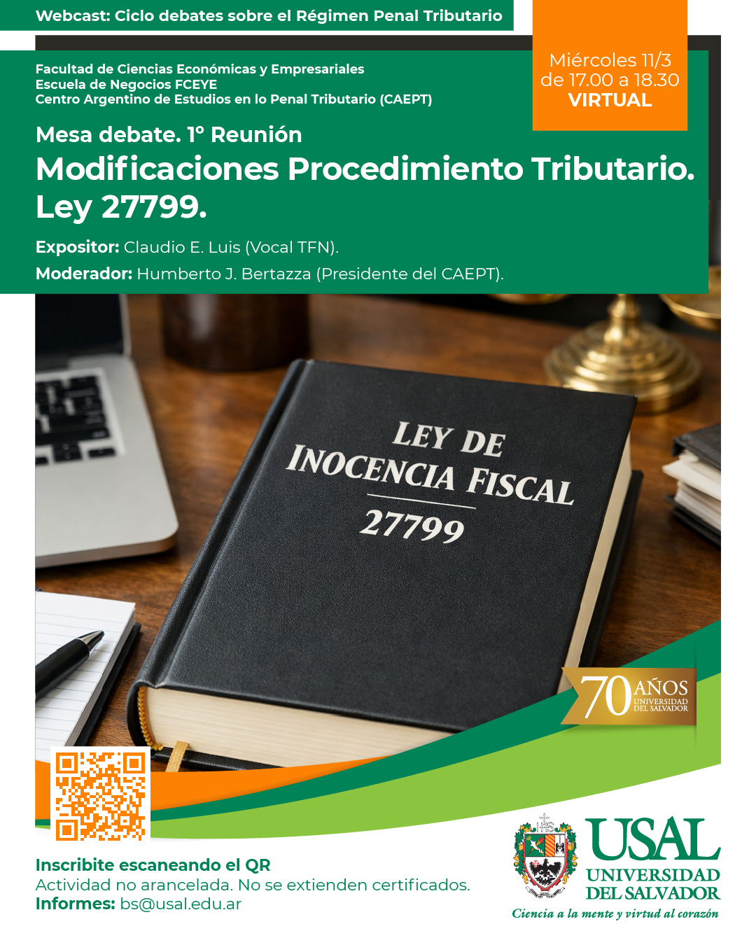 Organizan: Escuela de Negocios de la Facultad de Ciencias Económicas y Empresariales de la USAL - Centro Argentino de Estudios en lo Penal Tributario